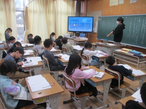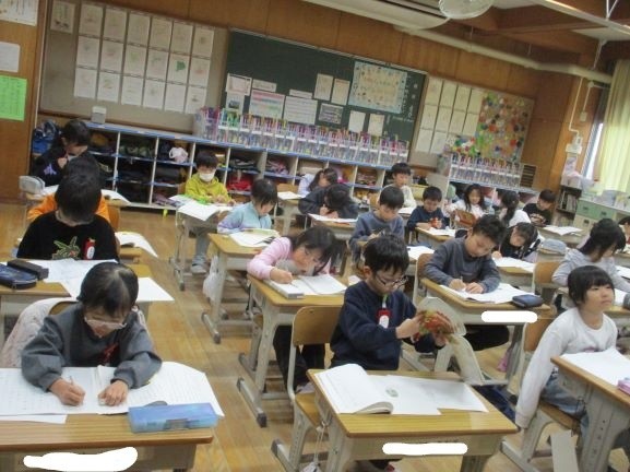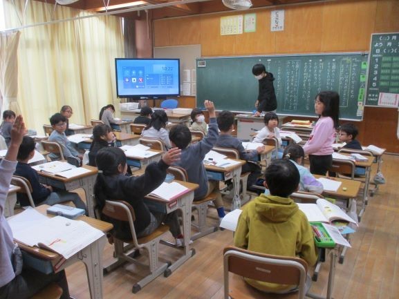 物語教材「みきのたからもの」の読み取りをしています。主人公みきと宇宙人ナニヌネノンとの温かい交流を描いた作品です。場面ごと「だれが」「何をした」「どんなできごとがあったか」を読み取っています。場面の様子や登場人物の行動などを具体的に想像し、物語の内容を捉えていきます。