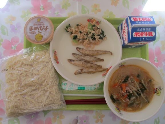 12月9日 給食 公開日 2025/12/09 更新日 2025/12/09 給食 今日の給食は、中華麺、牛乳、担々風味噌ラーメンスープ、わかさぎの唐揚げ、切り干し大根の中華和え、豆乳デザートエネルギー643キロカロリー、たんぱく質30.7グラムです 給食