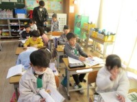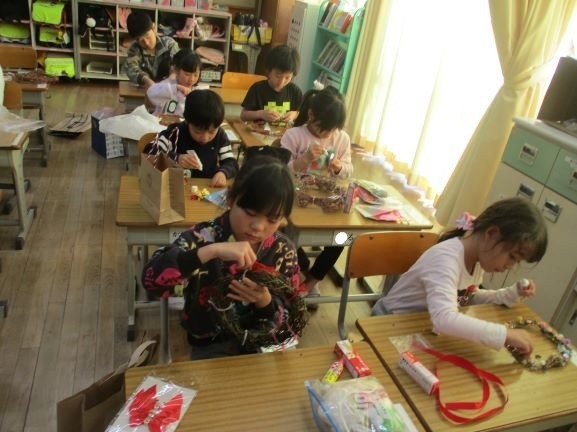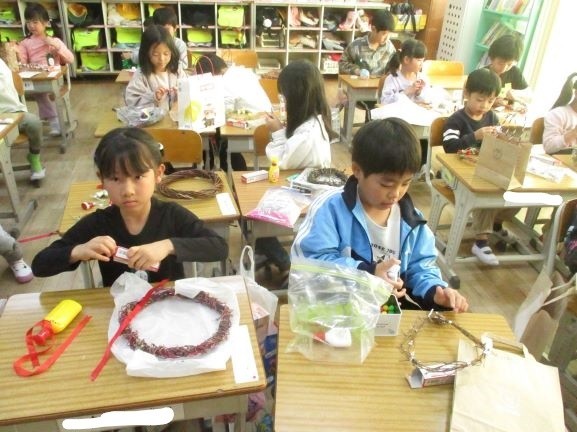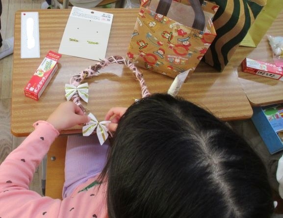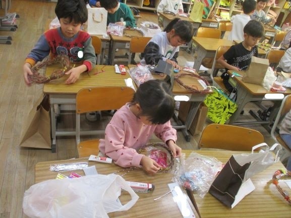 夏の間育てていた朝顔のつるでリースを作りました。今日はそのつるに、飾り付けをします。リボンやモールを巻いたり、持ってきたさまざまな飾りを付けていきました。時節柄、クリスマスリースに仕立てる子もいました。この飾りはどこがいいかなと位置や飾りと飾りのバランスを考えながら、工夫をしていました。たくさんの飾りを用意していただき、ありがとうございました。お家に持ち帰ったら、ぜひ飾ってあげてください。