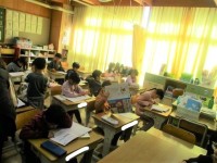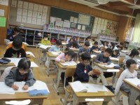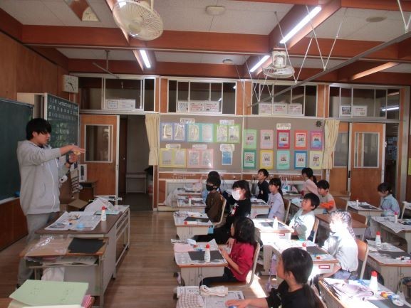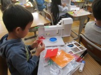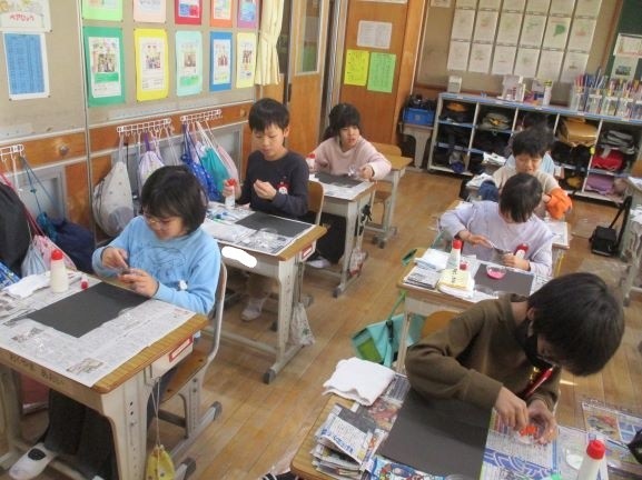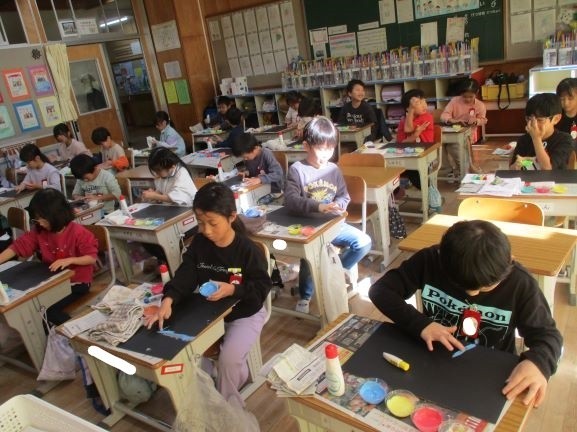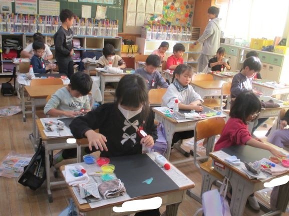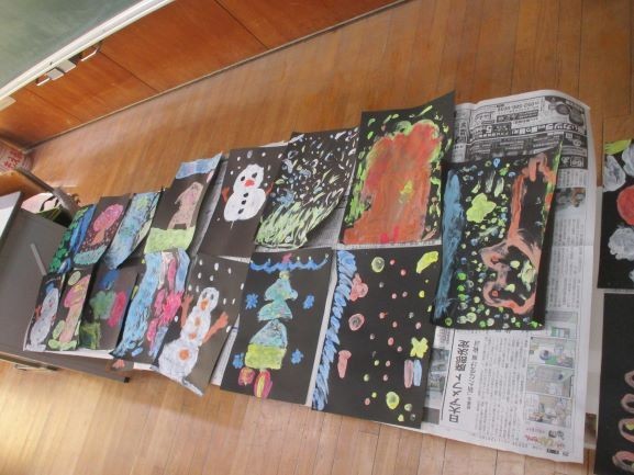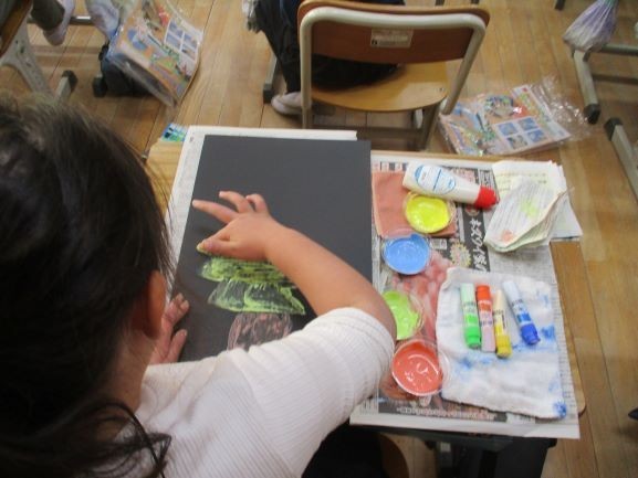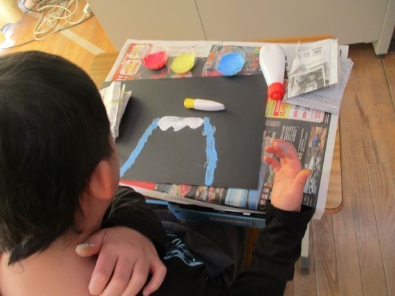 さて、次は本番です。段ボール紙に思い思いの絵を描いていきます。指や手などの身体感覚を働かせながら、色や形を工夫して作品づくりをしています。完成した作品は持ち帰ります。楽しみにしていてください。