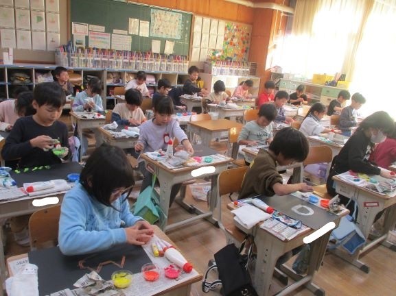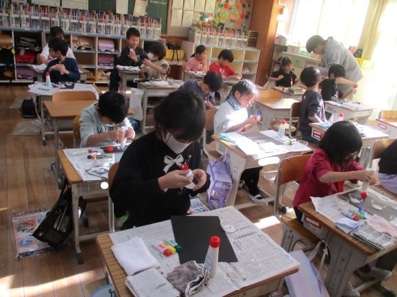 液体粘土と絵の具を混ぜ合わせて作る「とろとろ絵の具」で絵を描きます。教師の実演を見ているだけでも、とても楽しそうな教材で、早くやりたいという気持ちが出ていた子どもたち。まずは、色づくりをして試し描きをしてみます。パステルカラーのかわいらしい作品ができあがりました。