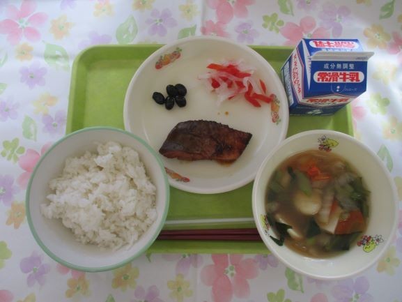 ご飯※1、牛乳、ぶりのみりん焼き、白玉雑煮、大根と人参の紅白なます※2、黒豆
