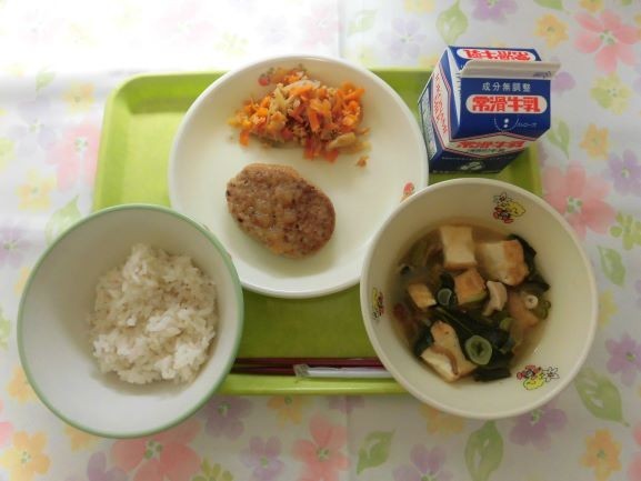 麦ご飯、牛乳、ハンバーグのおろしソースかけ、人参と蓮根のきんぴら※、実だくさん汁