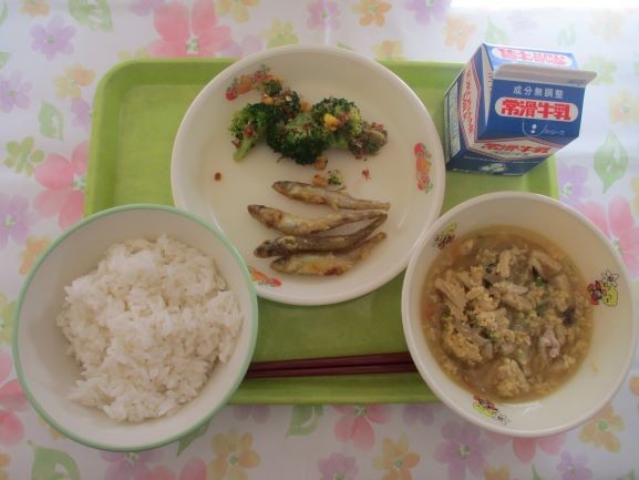 ご飯、牛乳、わかさぎのカレー風味、ごぼうと高野豆腐の卵とじ、ブロッコリーのおかか和え