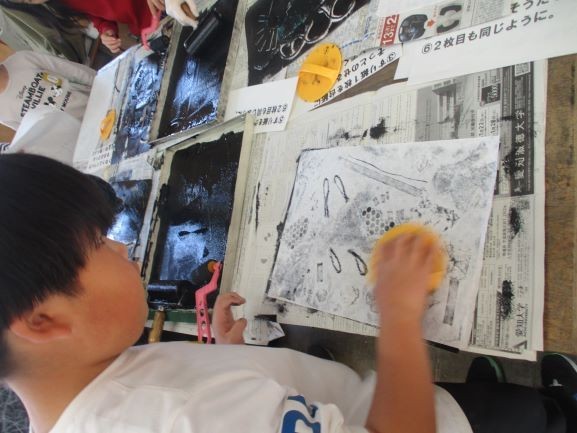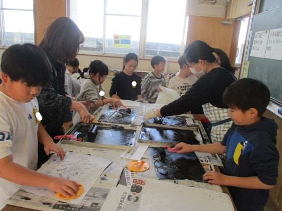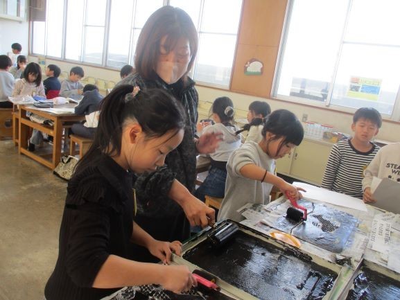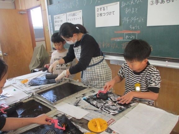 1月26日 刷っています(3年2組) 公開日 2026/01/26 更新日 2026/01/26 給食 紙版画の版が完成した子から刷る作業をしています。2年生のときは、カラーインクが染みこんでいるシールに水をつけて刷っていたので、インクで刷るのは初めてです。インクを伸ばして済まで丁寧にローラーをかけていきました。馬連でこすったら、完成です。納得のいく刷り具合になったようです。 +3 給食
