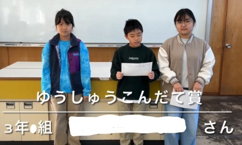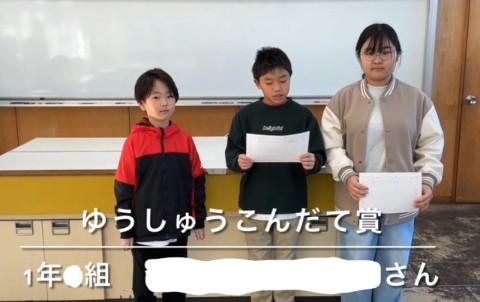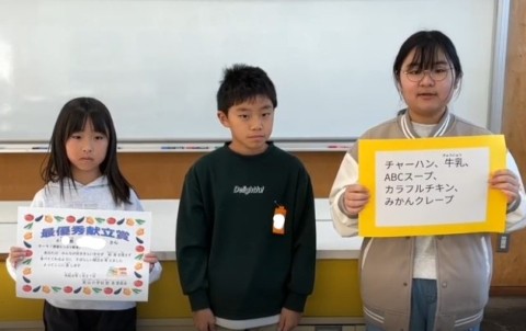 1月27日 学校給食週間2日目 公開日 2026/01/27 更新日 2026/01/26 学校行事 学校給食週間2日目の動画は、募集献立の表彰です。最優秀献立賞に選ばれた1名(写真1枚目)と優秀献立賞に選ばれた5名の表彰が行われました。最優秀献立賞は「野菜たっぷり給食」です。16種類の野菜やくだものを使った健康的な献立、とてもおいしかったですね。 +3 学校行事