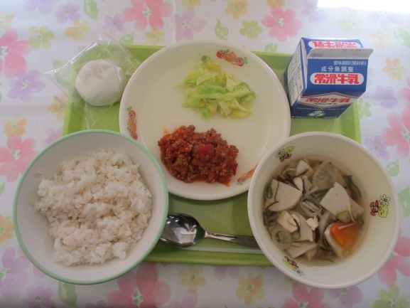 麦ご飯、牛乳、タコライス(タコミート、キャベツソテー)※1、もずく汁※2、大福餅