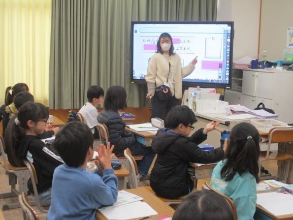 1月27日 小数(3年1組) 公開日 2026/01/27 更新日 2026/01/27 3年 3年生では1より小さい数として、分数と小数を学習します。分数はすでに2学期に学習したので、その考え方から小数について学んでいきます。1/10Lが0.1Lであることを覚えて、かさを小数で表す練習をしました。 +1 3年生