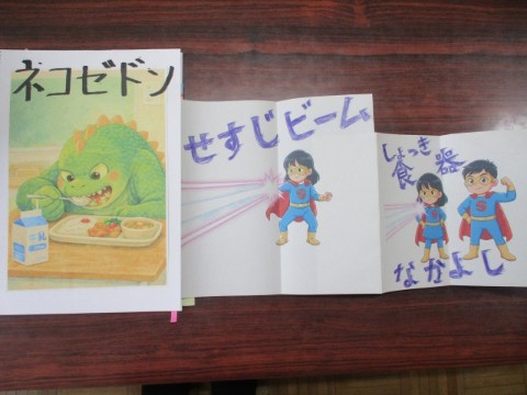 学校給食週間4日目は校長の話です。今回は栄養教諭と相談をして「食事のマナー」について話をすることにしました。子どもたちにわかりやすく伝えようために「東山小の給食の時間に2匹の怪獣が現れました」という架空のニュース番組風に伝えることにしました。口に食べ物を入れたままおしゃべりをする「クチャゴン」と食器を手に持たずに姿勢悪く食べる「ネコゼドン」を登場させ、それをヒーローが倒していく内容にしました。一番伝えたいことは「マナーは、『一緒に食べている人が気持ちよく過ごすことができる思いやり』」ということです。けやきっ子一人一人の力で誰もが楽しい給食の時間をつくってほしいです。