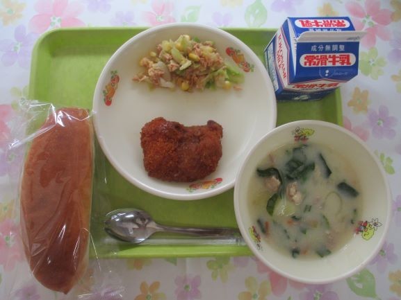 愛知の米粉入りパン、牛乳、チキンシュニッチェル※1、ツナサラダ(和風ドレッシング)、じゃがいもの豆乳シチュー