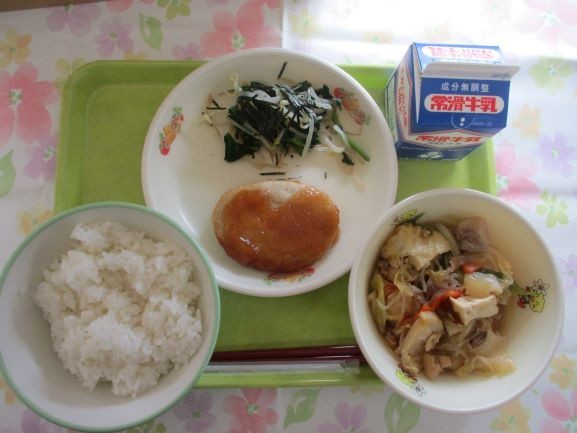2月2日 給食 公開日 2026/02/02 更新日 2026/02/02 給食 今日の給食は、ご飯、牛乳、豆腐のハンバーグのみぞれ餡かけ、白菜と鶏肉の煮物、磯香和え(刻みのり)エネルギー640キロカロリー、たんぱく質29.7グラムです 給食