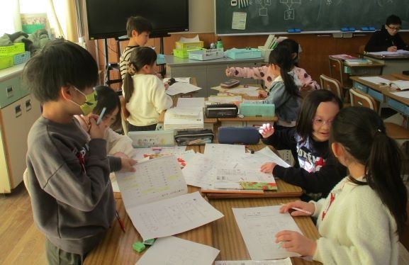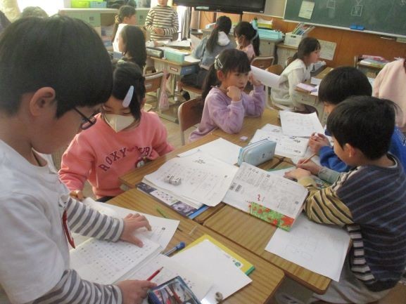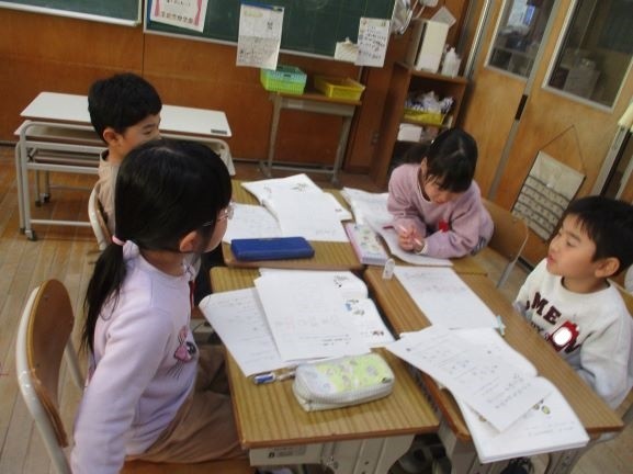 国語の教科書で人気のキャラクターであるカンジー博士が、漢字を合体させる機械や、漢字を作る弓矢を発明しました。そこで、その仕組みを使って、漢字クイズ大会を開くことになりました。今日はグループごとにどんな問題がいいのか考えています。なかなかいいアイディアが出ていますが、ここで紹介してしまうと答えが分かってしまうので、秘密にしておきます。クイズ大会をお楽しみに。