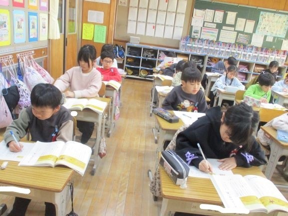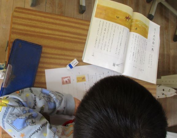 物語教材「スーホの白い馬」の読み取りをしています。それぞれの場面のスーホや白馬の気持ちと様子を読み取っていきます。今日は、スーホの人物像と、白馬との出会いを読み取り、様子を想像しました。場面ごとに要約することに最初は戸惑ったようですが、やり方が分かると自分たちで読み取ることができていました。