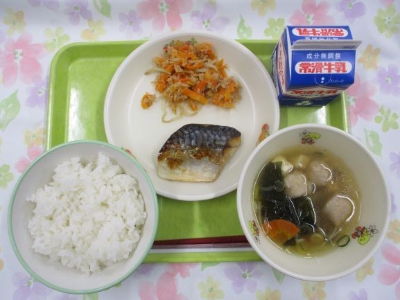 ご飯、牛乳、鯖の塩麹焼き、人参とツナの炒め物、鶏団子汁