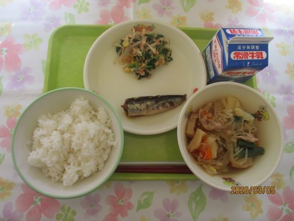 3月5日 給食 公開日 2026/03/05 更新日 2026/03/05 給食 今日の給食は、ご飯※おおぶニック学校給食米、牛乳、鰯の生姜煮、じゃがいもの旨煮、菜花の和え物エネルギー634キロカロリー、たんぱく質25.7グラムです 給食