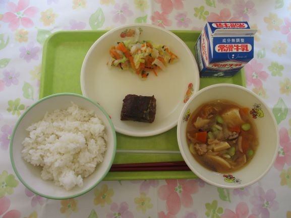 ご飯※おおぶニック学校給食米、牛乳、宗田鰹のおかか煮、生揚げと筍の旨煮、野菜とわかめの和え物