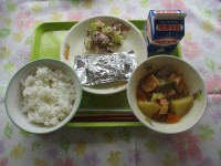 4月13日 給食 公開日 2026/04/13 更新日 2026/04/14 給食 今日の給食は、ごはん、牛乳、マーボー豆腐、ひじきと春雨の中華あえ、お祝いデザートエネルギー653キロカロリー、たんぱく質25.7グラムです 給食