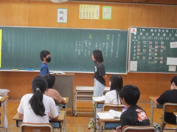表情や口調、表現の仕方を工夫して、「相手に伝えにくいことを伝える」学習です。相手の気持ちを受け止めつつ、代案を出しながら納得解を得るように話し合っていきます。テーマに沿った二人のやりとりを見て、どんな点がよかったのか、改善することはないのか話し合いました。事実を具体的に説明する、自分の気持ちや考えを述べる、提案や要望を伝えるというポイントを押さえながら、伝えにくいことを伝える練習をしました。