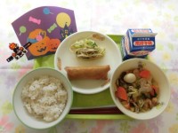 蕗入りご飯(アルファ化米)、牛乳、鰯の生姜煮、野菜とわかめの和え物、豆腐と湯葉の澄まし汁