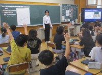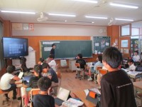 教育実習生による授業です。新幹線内の絵を見ながら、どんな工業製品があるのか考え...