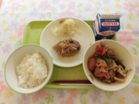 今日の給食は、ご飯、牛乳、焼きなすの味噌かけ、焼き豚と野菜の炒め物、鰯入りつみれ...