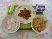 今日の給食は中華麺、牛乳、豆乳ちゃんぽんスープ、揚げ餃子、切り干し大根の中華和え...