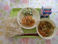 今日の給食は、白玉うどん、牛乳、和風あんかけ汁、さつまいものかき揚げ、野菜とわか...