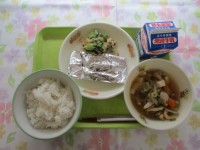 今日の給食は、ご飯、牛乳、秋刀魚の銀紙焼き、青菜のアーモンド和え、けんちん汁エネ...