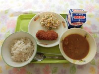 今日の給食は麦ご飯、牛乳、カレー、まめまえサラダ(ごまドレッシング)、梨エネルギ...