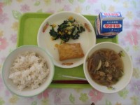 今日の給食は麦ご飯、牛乳、けんちん信田の和風だれかけ、野菜のおかか和え、のっぺい...