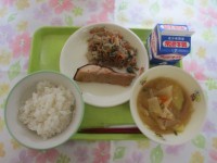 今日の給食は、ご飯、牛乳、秋刀魚の銀紙焼き、青菜のアーモンド和え、けんちん汁エネ...