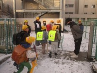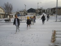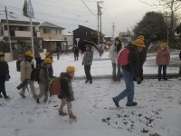 降り出した雪が一気にあたりを白くした中、こどもたちが登校してきました。今日は10日ですので、門では生活委員があいさつ運動をしています。雪の日は足下に注意しながら登校してきますが、時折足を滑らせる児童もいました。