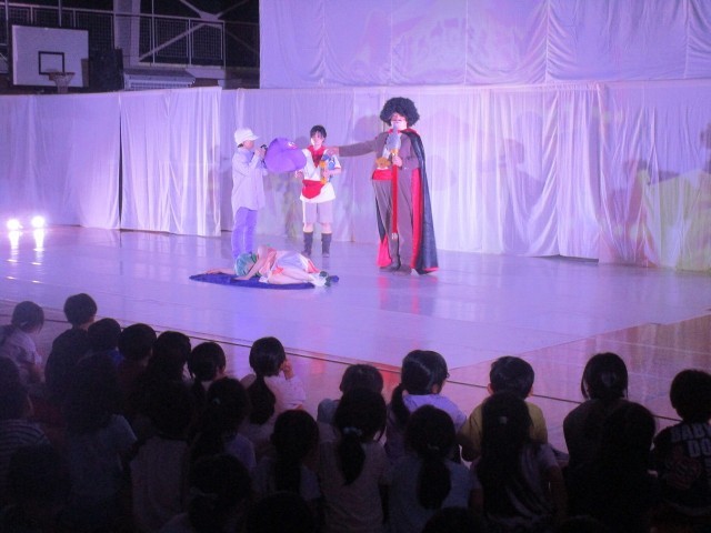 観劇会 公開日 2025/10/06 更新日 2025/10/06 学校行事 10月3日に、観劇会が行われました。低学年と高学年で2部制にして、演劇を観ました。プロジェクションマッピングを使って壮大に繰り広げられる演出に、こどもたちは引き込まれていました。声援を送ったり、拍手で盛り上げたりしながら、一体となって劇を楽しんでいました。 学校行事