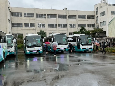 修学旅行に出発です 公開日 2025/10/22 更新日 2025/10/22 6年 今日から6年生が修学旅行に出かけます。あいにくの雨となってしまいましたが、子どもたちは元気いっぱいです。出発式を行った後、バスに乗り込み、奈良に向けて出発しました。 +2 6年生
