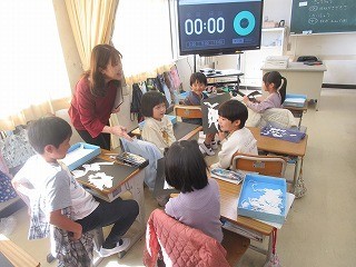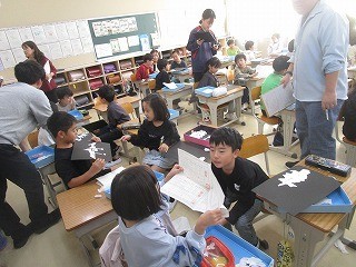 2年生の図工です。画用紙をいろいろな形に自由に切って、できたものを貼り付けて、アート作品を作っていきます。自分のイメージを伝えたり、アドバイスをもらったりしながら、作品を完成させていきます。