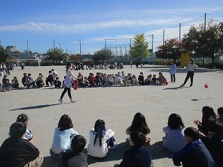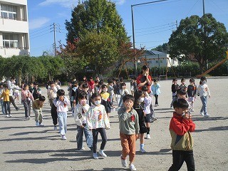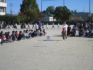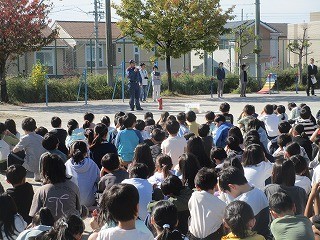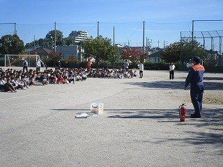 2時間目に、火災避難訓練を行いました。口をハンカチなどで覆い、姿勢を低くしながら静かに避難ができました。運動場へ避難後は、消防署の方のお話と、消火器の使い方の訓練を行いました。