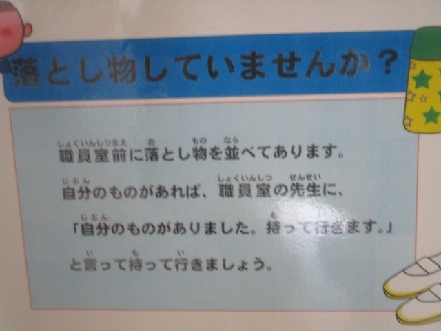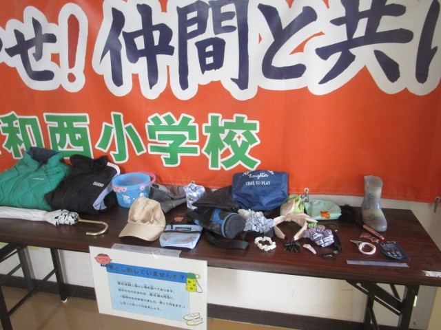 2学期もあと2週間あまりとなりました。職員室前の廊下には、2学期中の落とし物が並べられています。落とし主が見つかる落とし物もありますが、まだまだたくさんの迷子の落とし物が持ち主のもとに帰りたがっています。保護者の皆様も、保護者会でお越しになった際には、ぜひ、職員室前をご覧いただければと思います。