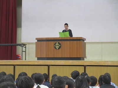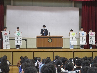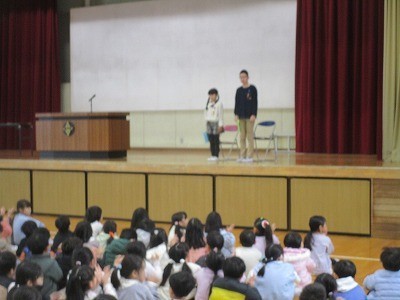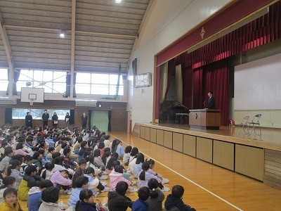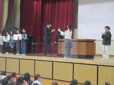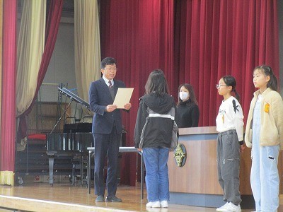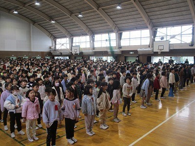 2学期終業式 公開日 2025/12/23 更新日 2025/12/23 学校行事 2学期終業式が行われました。校長講話の後、代表児童2名からの発表がありました。頑張ったことやこれから頑張りたいことなど、気持ちのこもったしっかりとした発表でした。最後の校歌斉唱では、元気な歌声が体育館いっぱいに響いていました。式後には表彰を生徒指導担当から冬休みの生活についての話がありました。 +5 学校行事