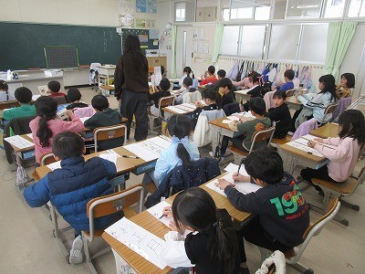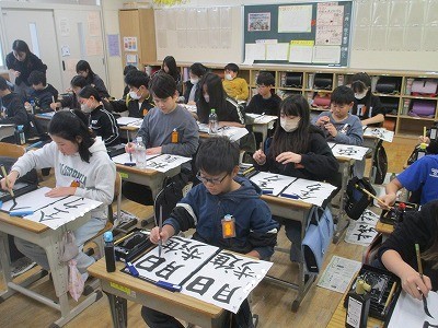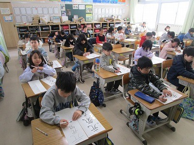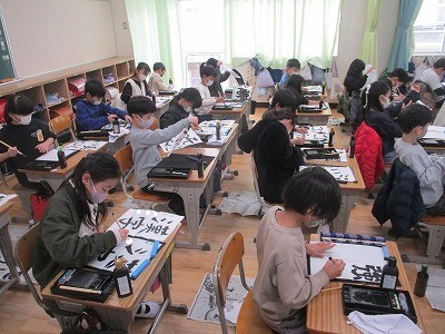 書き初め会 公開日 2026/01/08 更新日 2026/01/08 今日の出来事 書き初めを行いました。1・2年生は硬筆で全員同じ言葉を書いています。3年生から6年生は毛筆で、新年に向けそれぞれ思い思いの言葉を選び、心を込めて書いていました。厳かな音楽が流れ、落ち着いた雰囲気で取り組んでいました。 +3