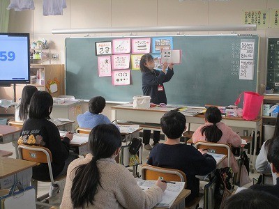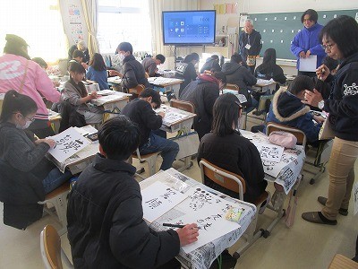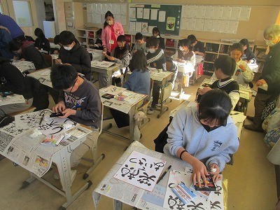 己書の授業 公開日 2026/01/21 更新日 2026/01/21 6年 日本己書道場の師範の方々を講師に招き、6年生が己書を体験しています。筆ペンを使い、色紙に文字だけでなく絵なども交えながら、自由なタッチで想いを表現していきます。完成した作品にみんな満足そうでした。 +2 6年生