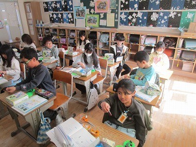 3年生の理科の時間です。磁石の教材を使って、その性質を学習していきます。今日はクリップをひもでつないで固定し、磁石と上手に距離を取ることで、磁石にくっついていないのにクリップが宙に浮いていることを確かめていました。不思議な体験で、こどもたちも興味津々でした。