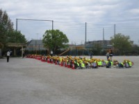 1年生のこどもたちが、下校します。運動場に方面ごとに集まって、先生のお話を聞いて...