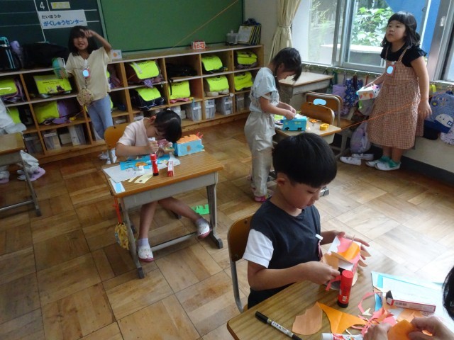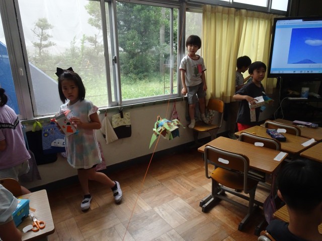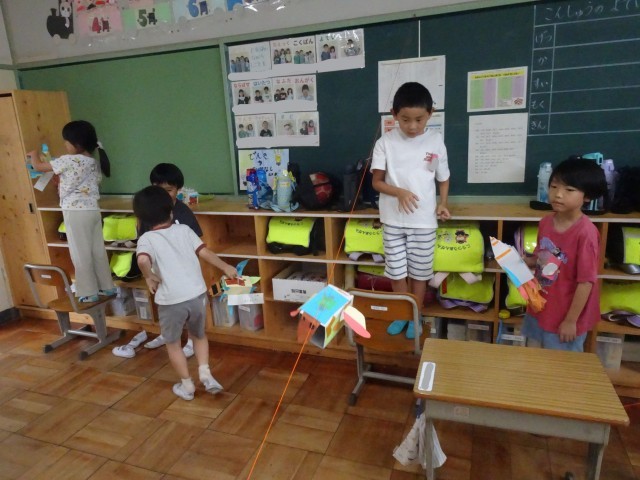 作品ができあがった子から、実際にひもにかけて滑らせています。
