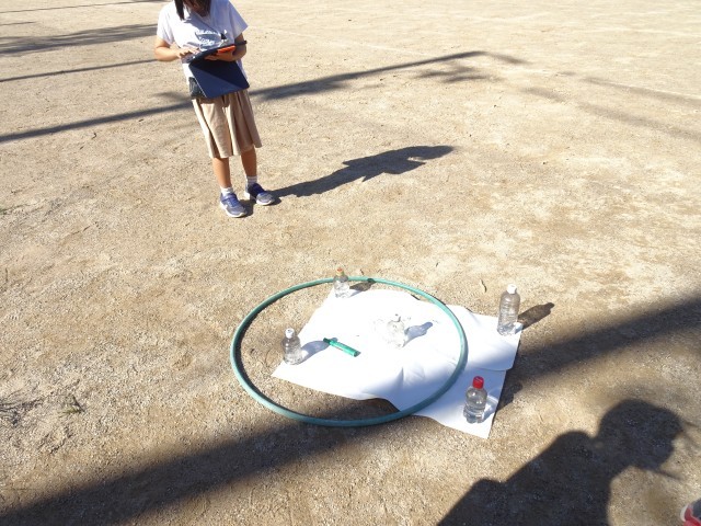 子どもたちの準備したペットボトルの影が、日時計のように動いたことが分かります。
