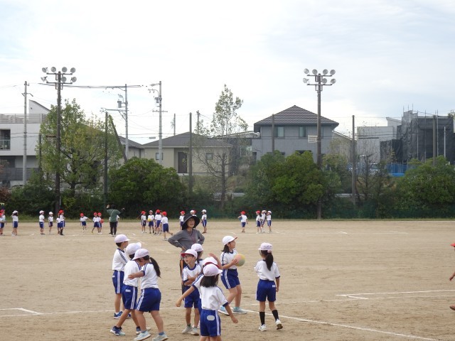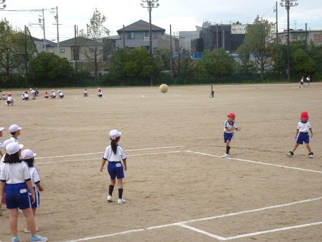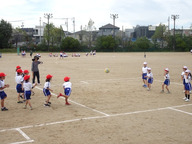 どちらのクラスもドッジボールをしているようです。