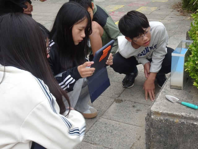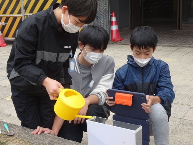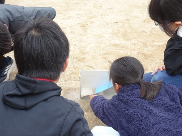 容器に砂と水を交互に入れて、地層ができる様子を観察しています。