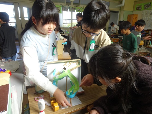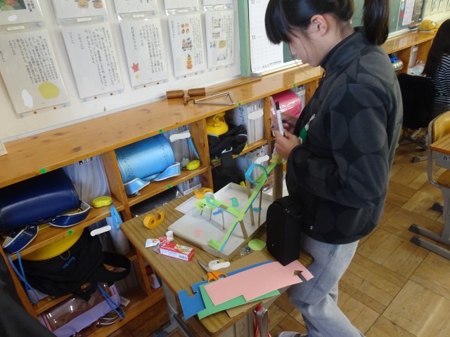 自分の作品ができあがり、ビー玉の転がるコースが3種類もあることを自慢げに教えてくれました。