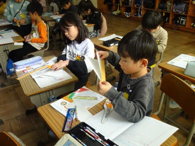 今日は、長方形の紙を使って、いろいろな辺の長さや角の大きさを比べています。