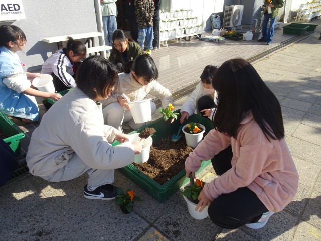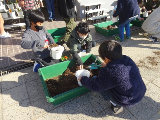 4年生に引き続き、5年生もパンジーの鉢植えの準備をしています。