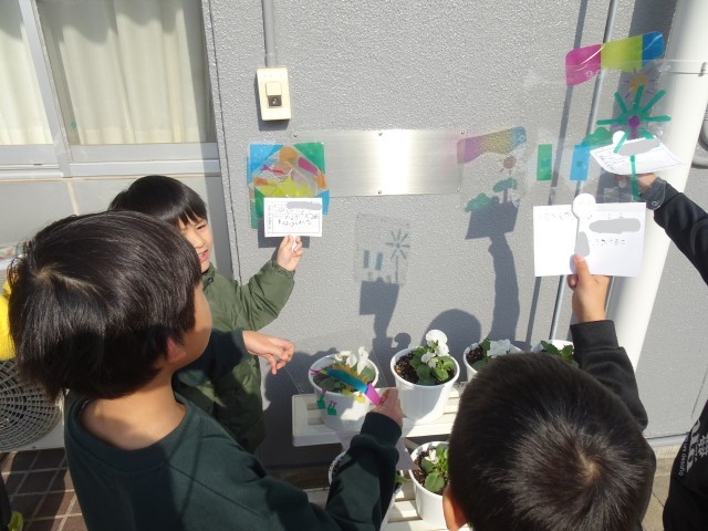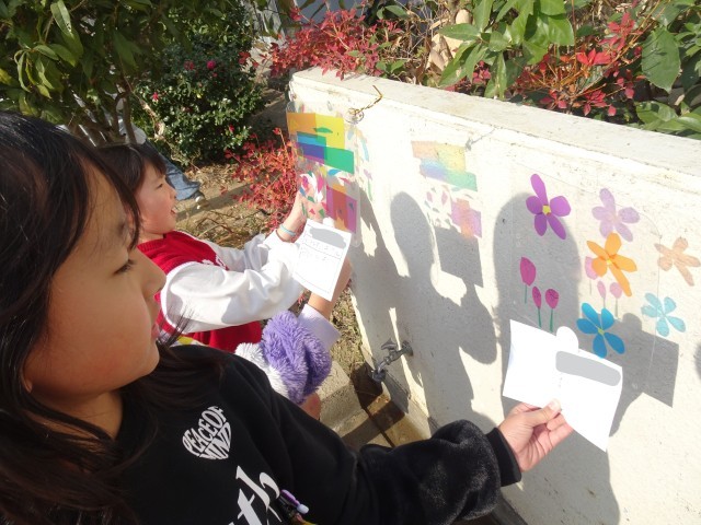 校舎の壁や地面、友達や先生の背中など、いろいろなところに写して楽しみました。